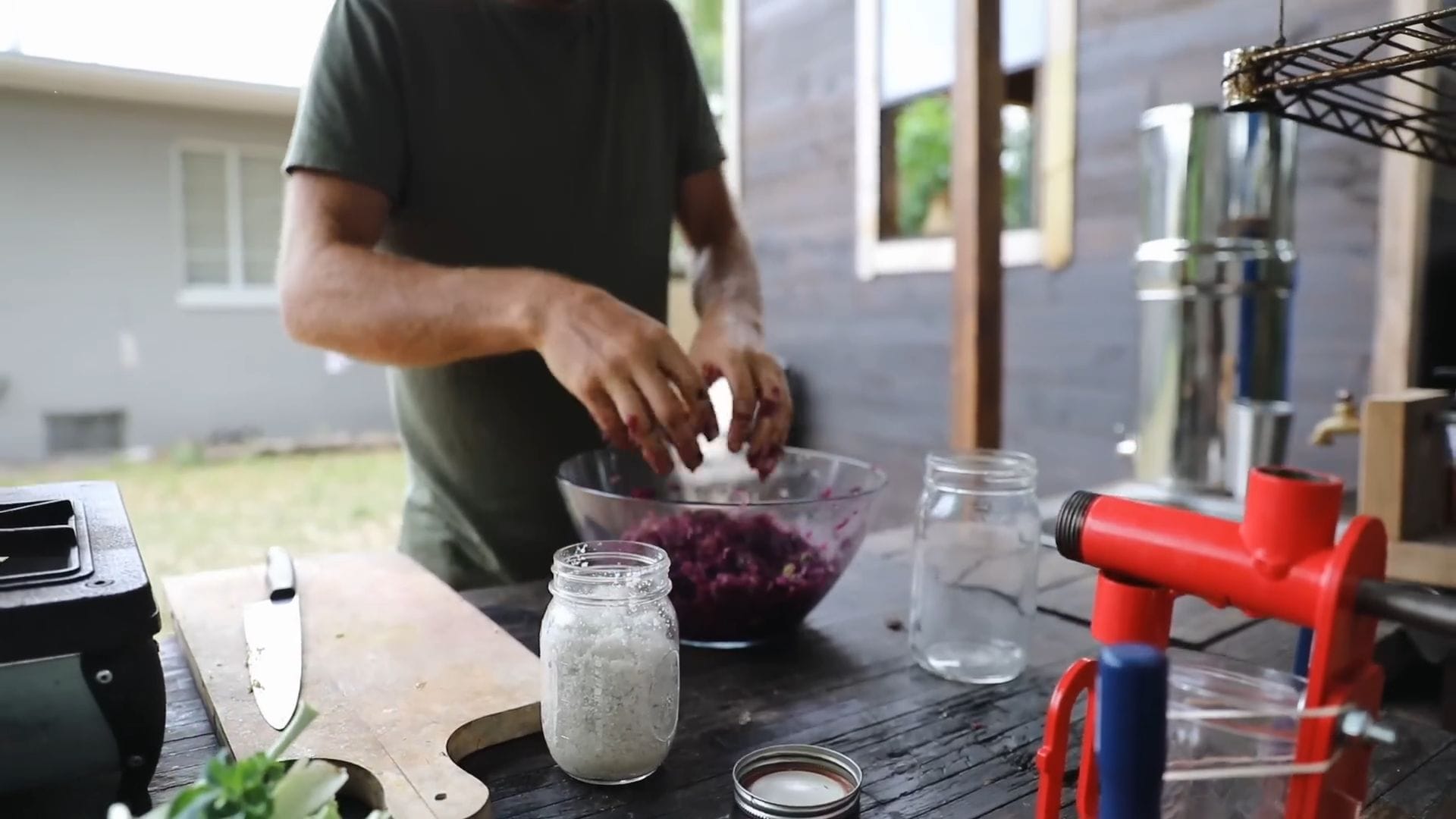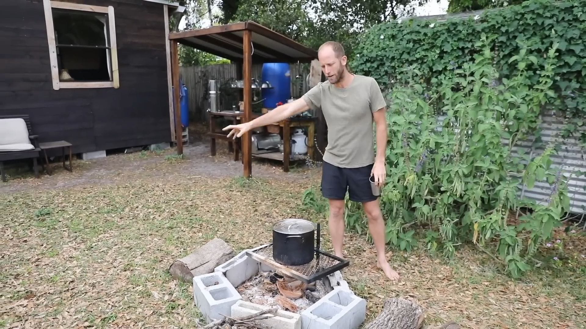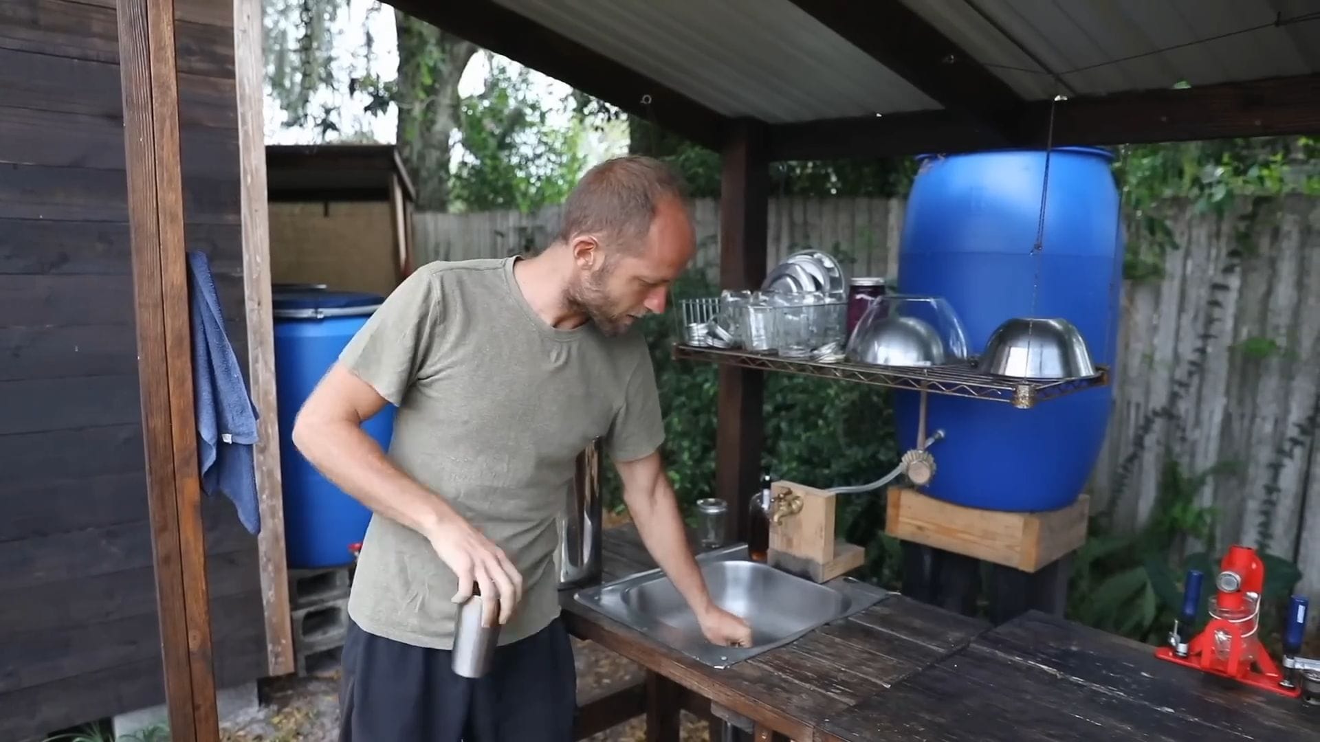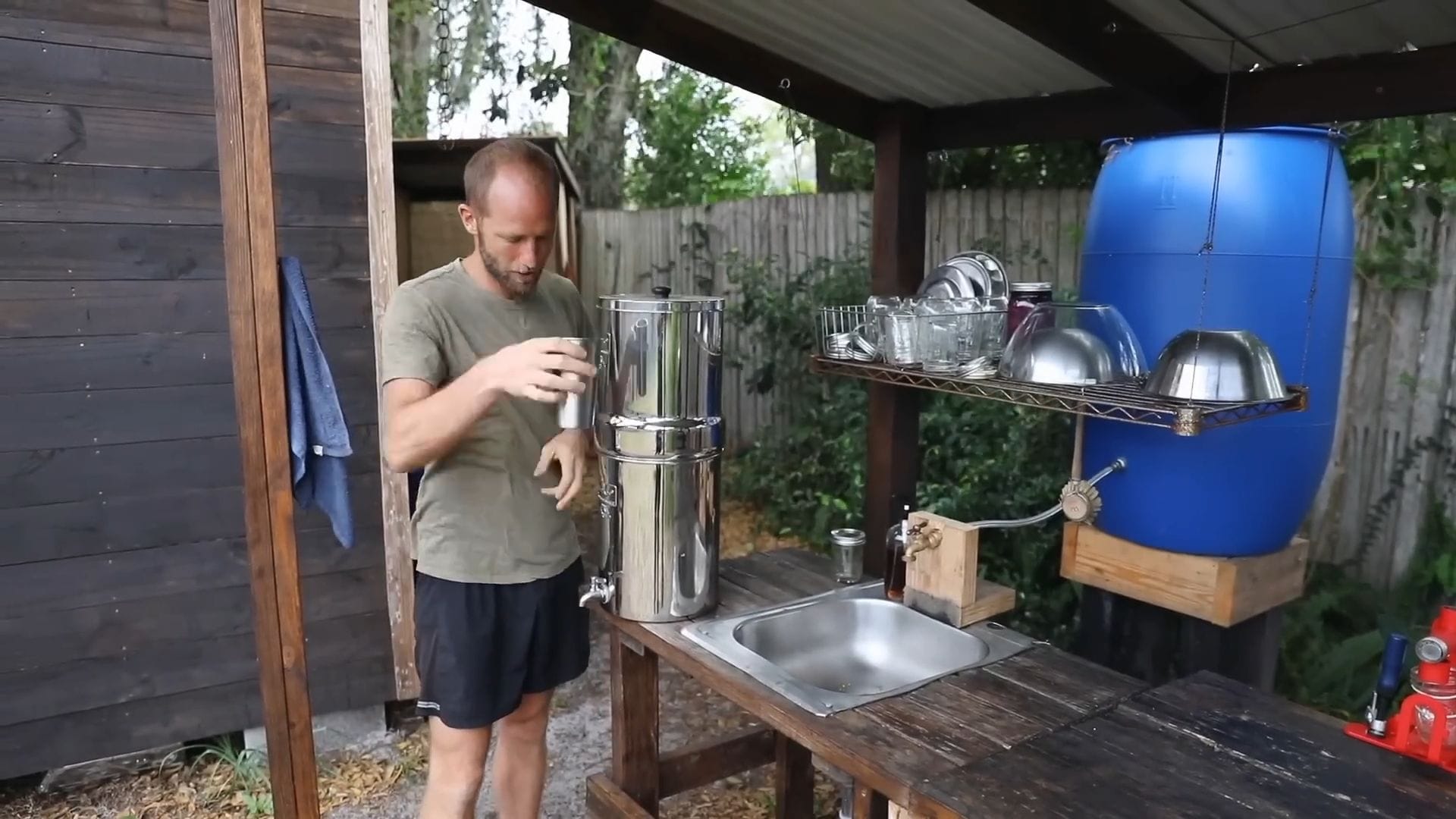 The outdoor kitchen serves as the heart of daily operations, where Rob typically prepares three meals each day using exclusively rainwater.