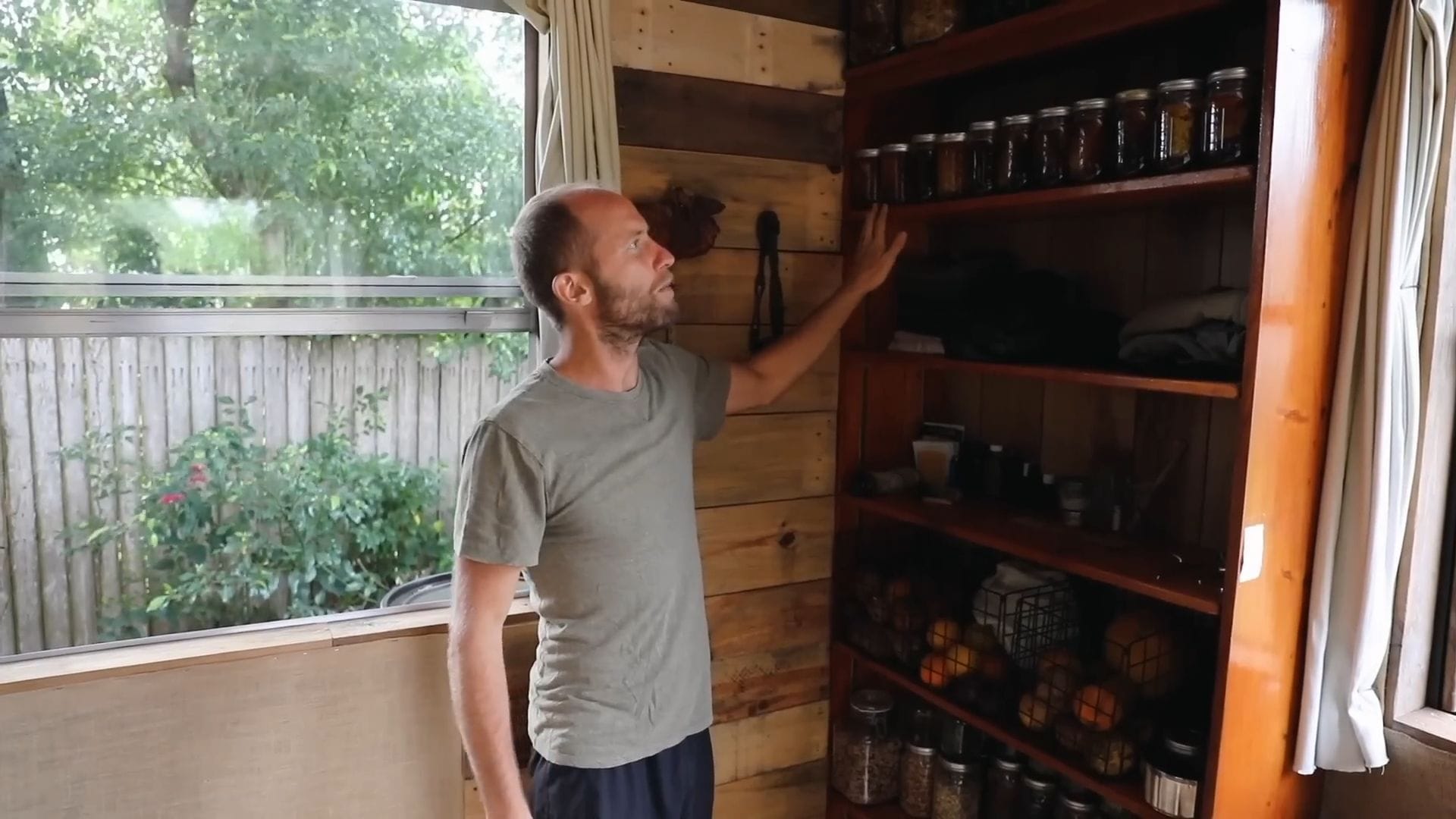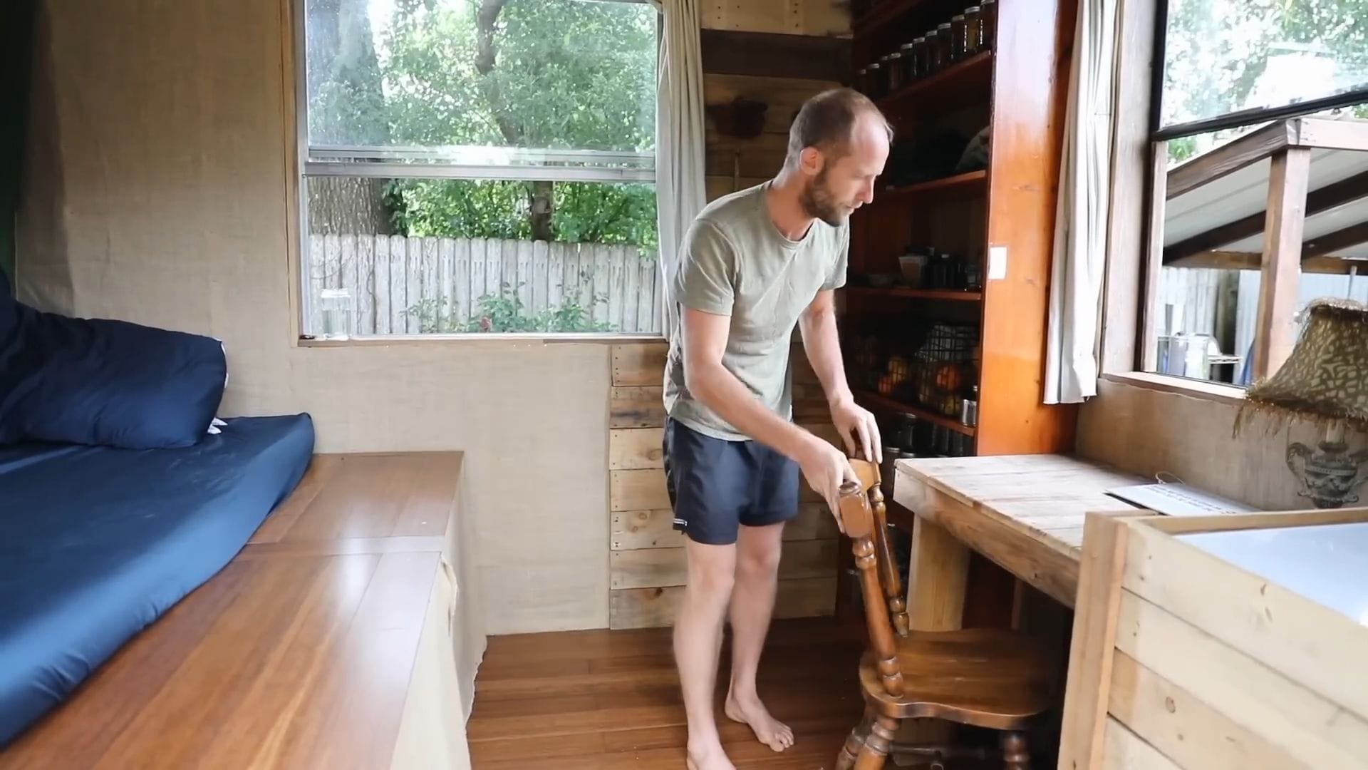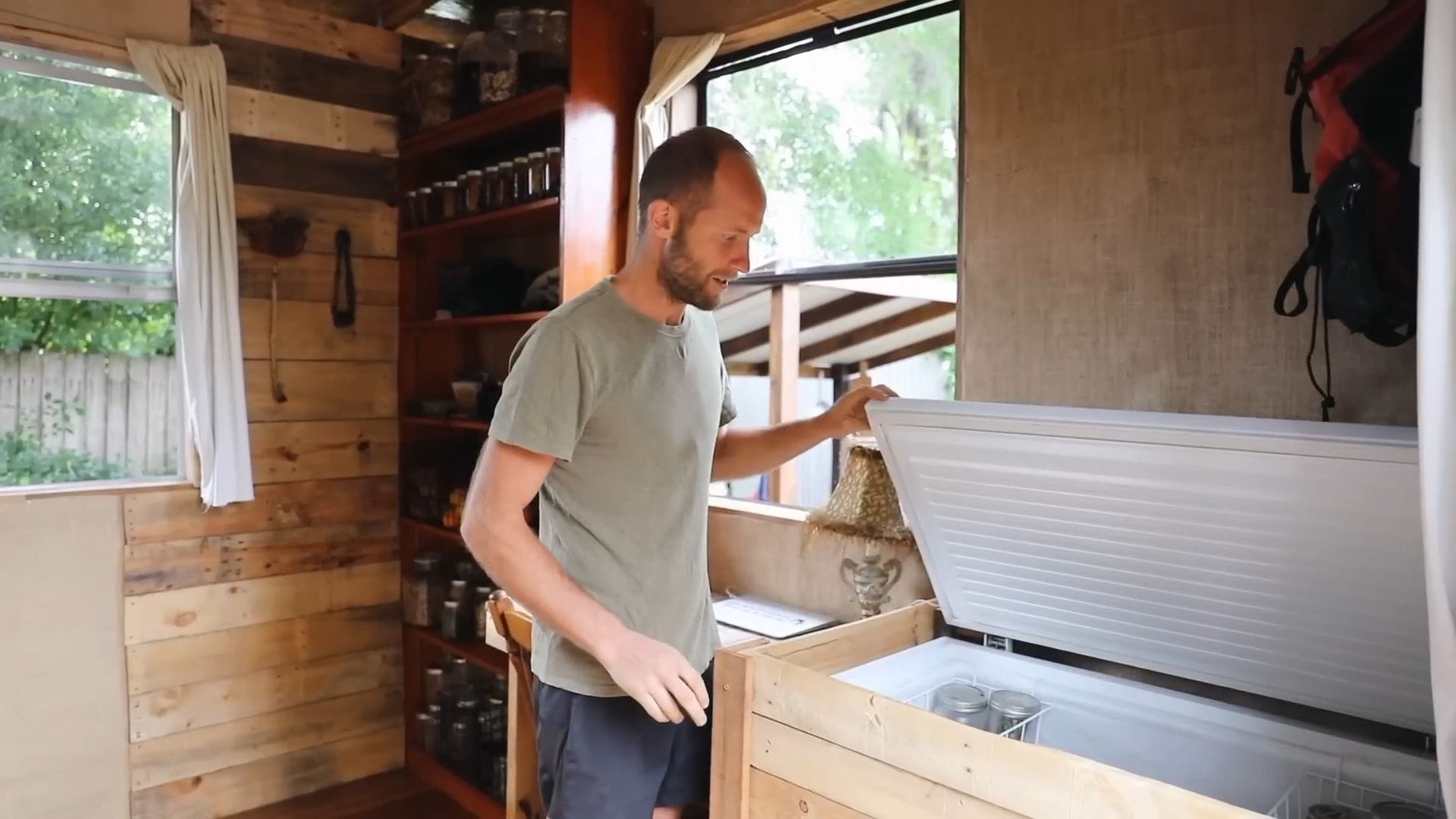 The real star of this tiny house isn’t furniture – it’s food storage, supporting Rob’s incredible project of growing and foraging 100% of his food for an entire year.