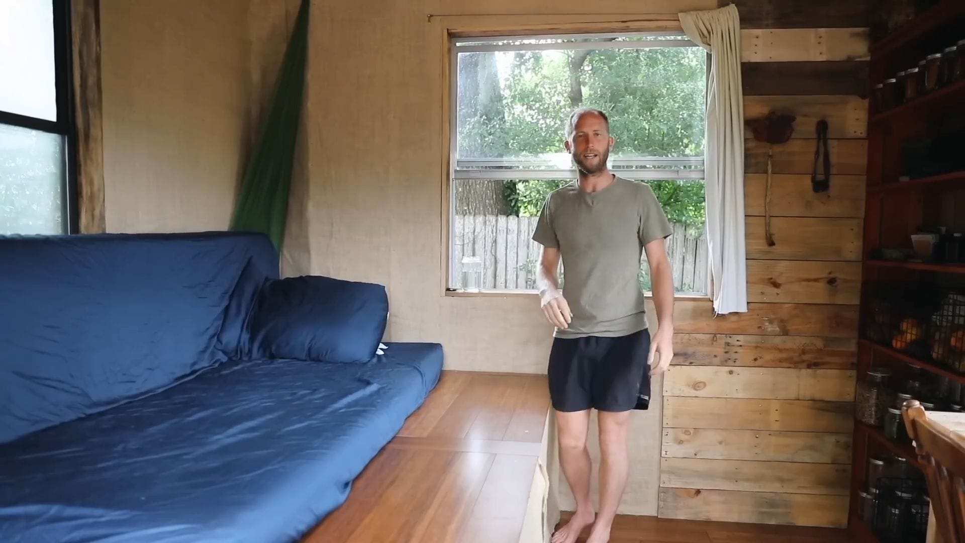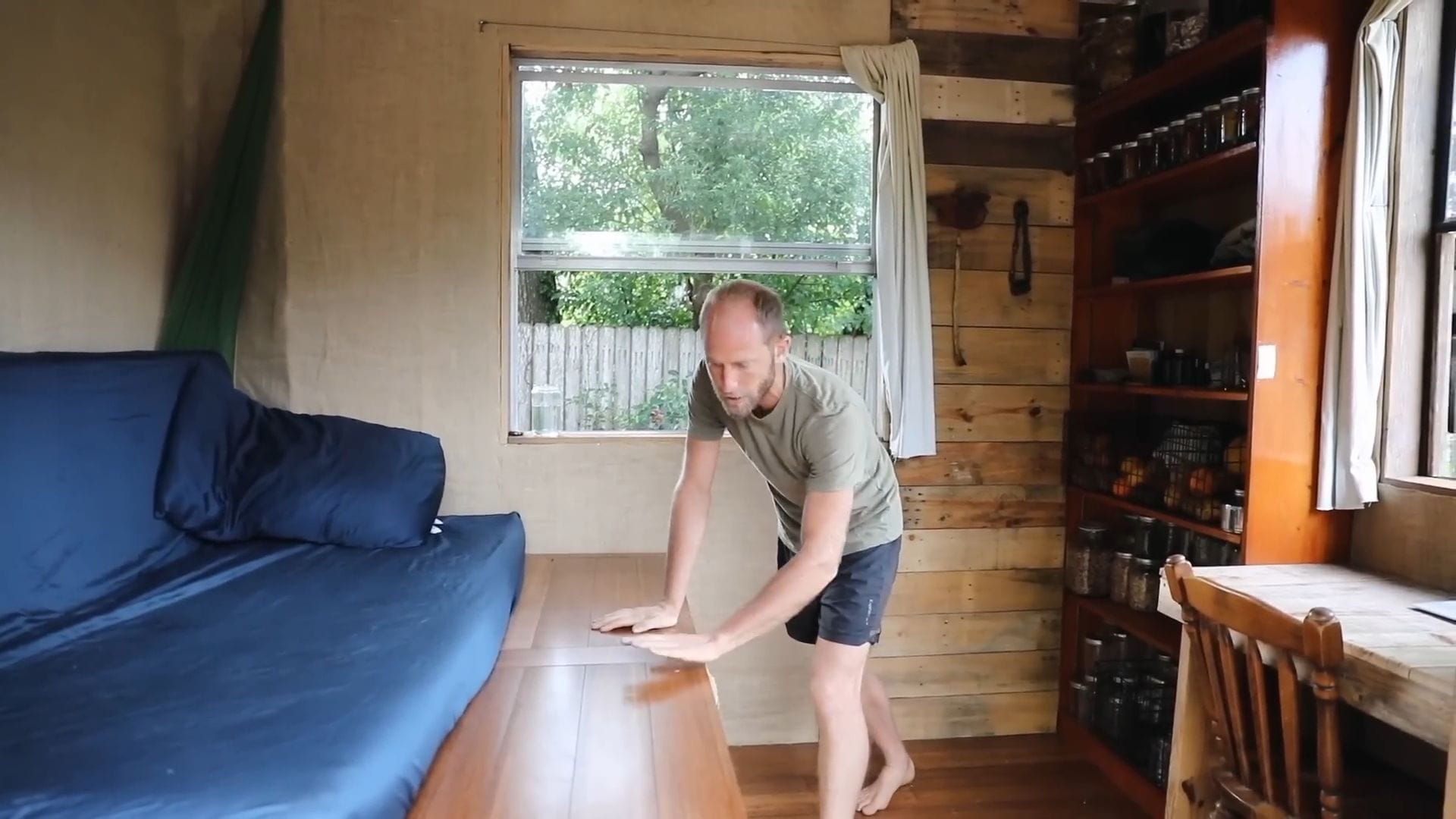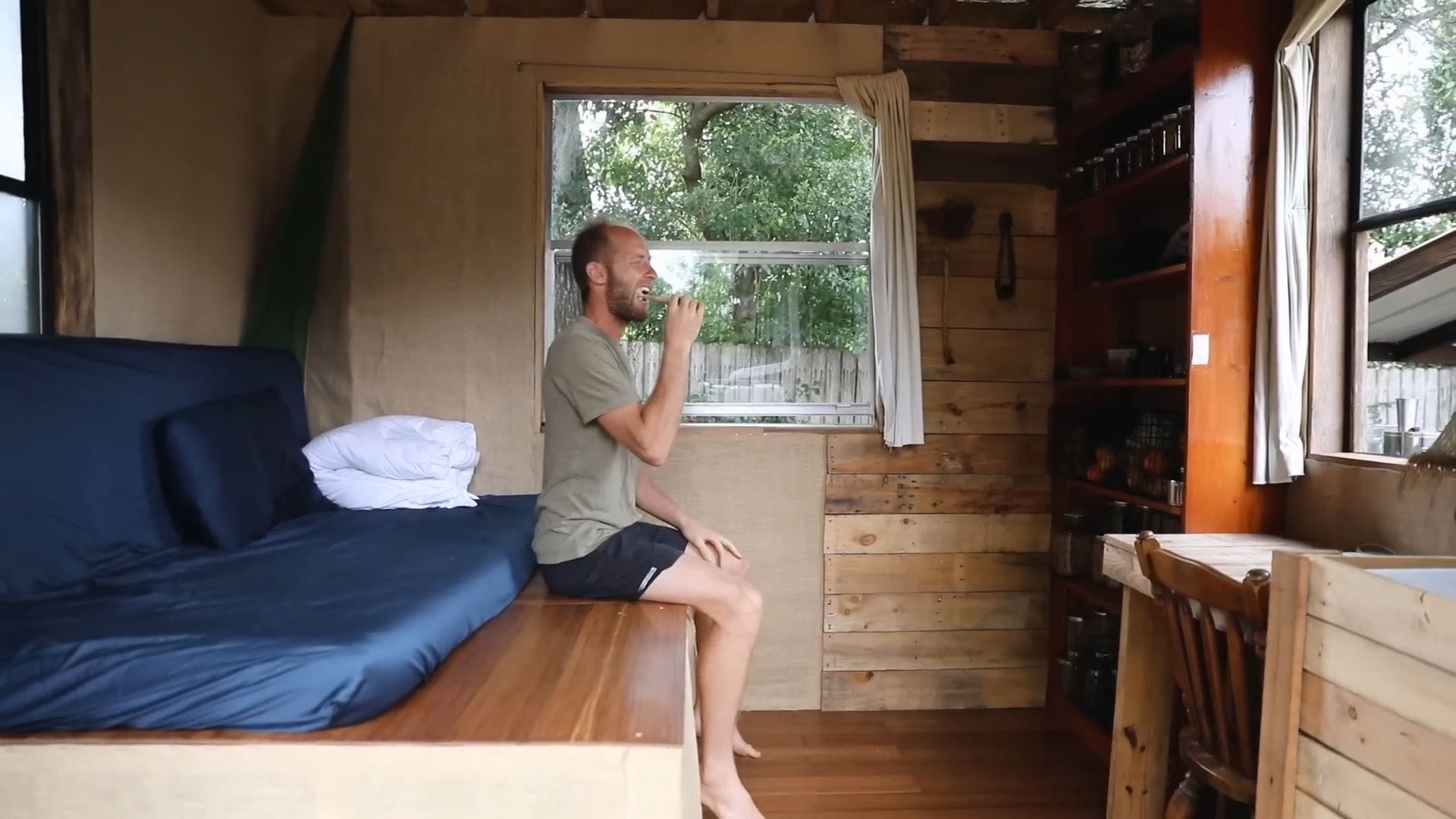 The real star of this tiny house isn’t furniture – it’s food storage, supporting Rob’s incredible project of growing and foraging 100% of his food for an entire year.