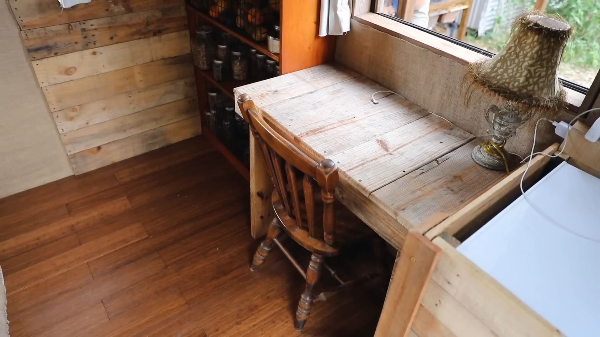 The desk area showcases more creative repurposing, built entirely from pallets and construction scraps.