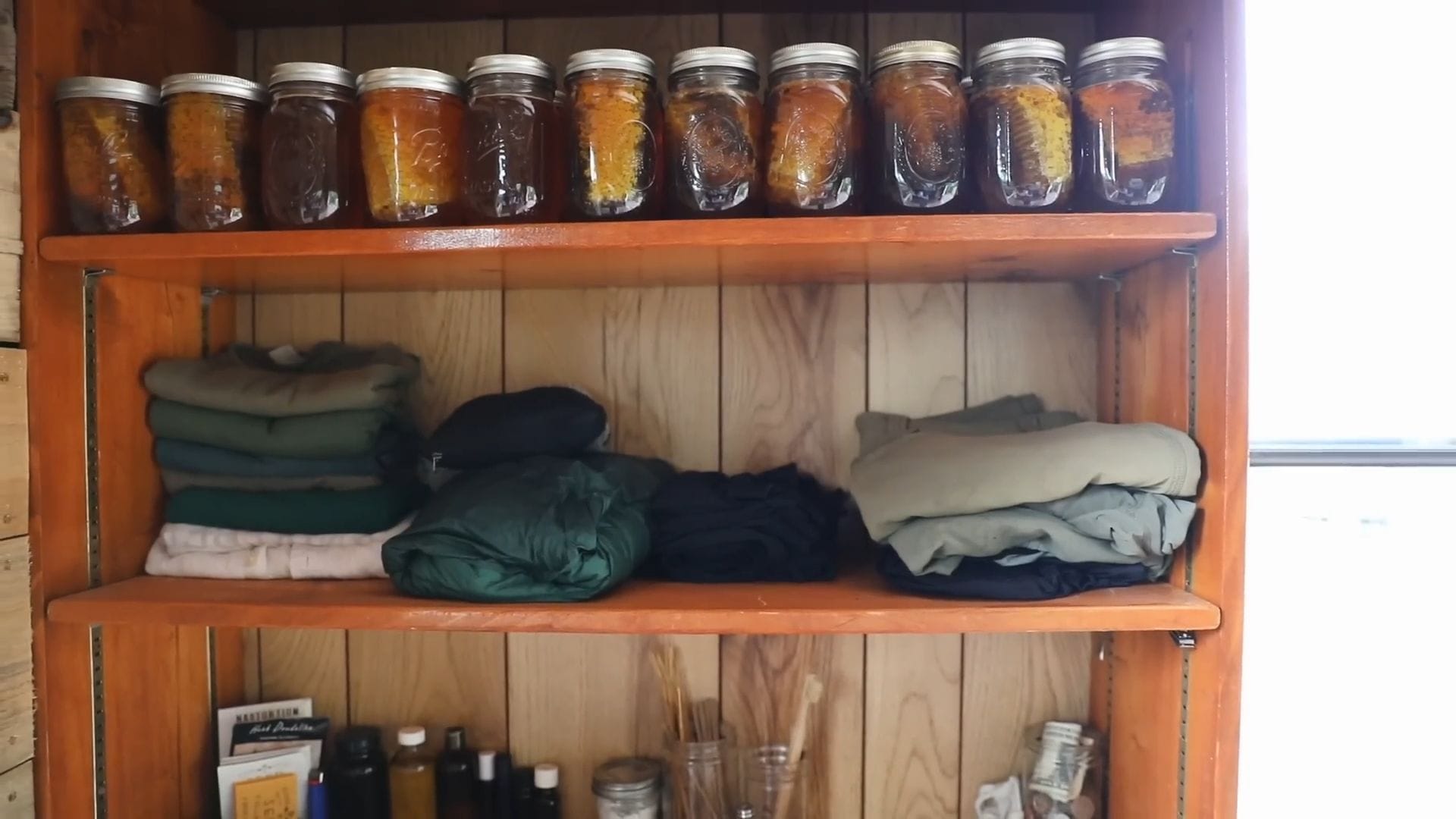 The back storage area reveals the true scope of this food independence project, featuring jars of honey from four beehives that produced 75 pounds last fall.
