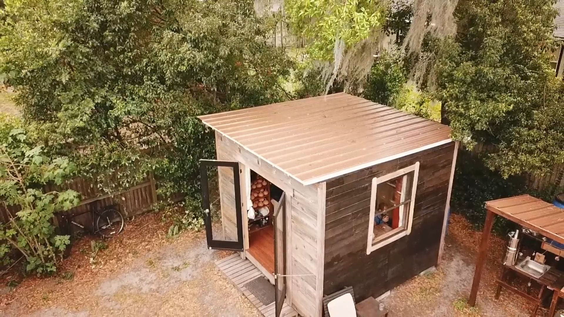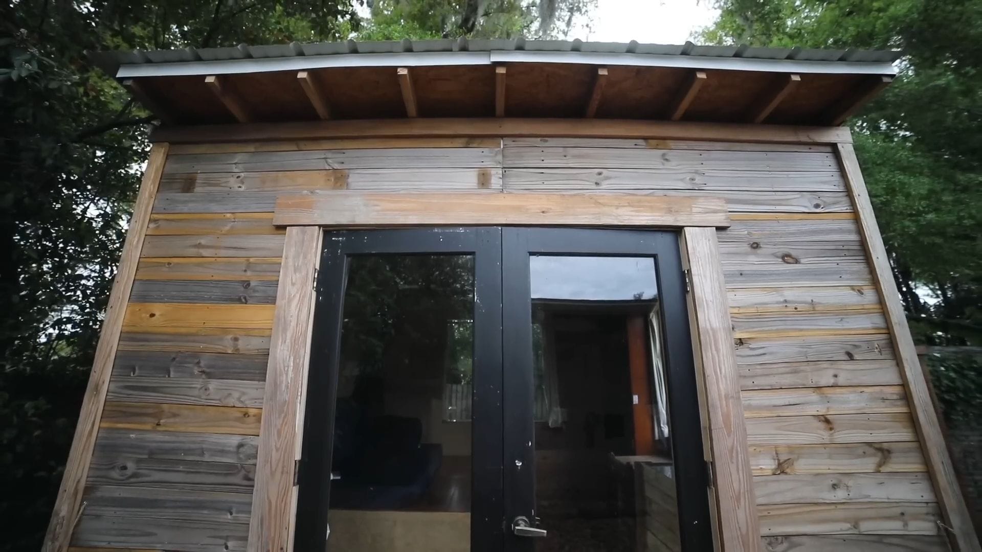 The metal roof and windows came from Craigslist finds, while the doors were also secondhand treasures.