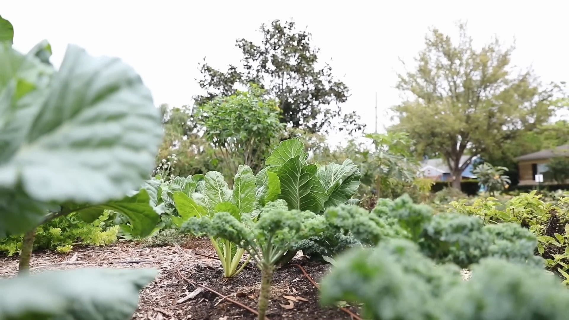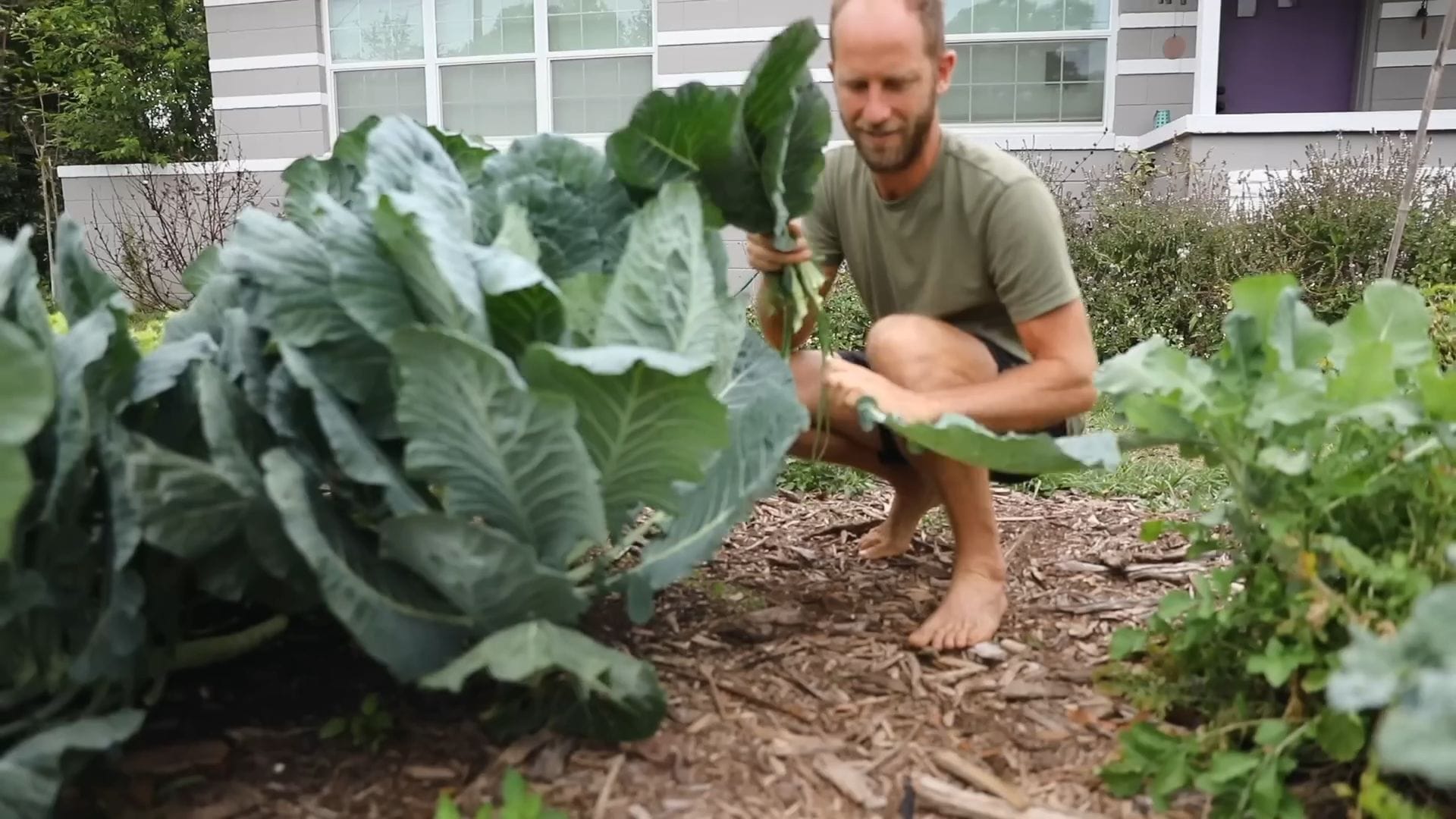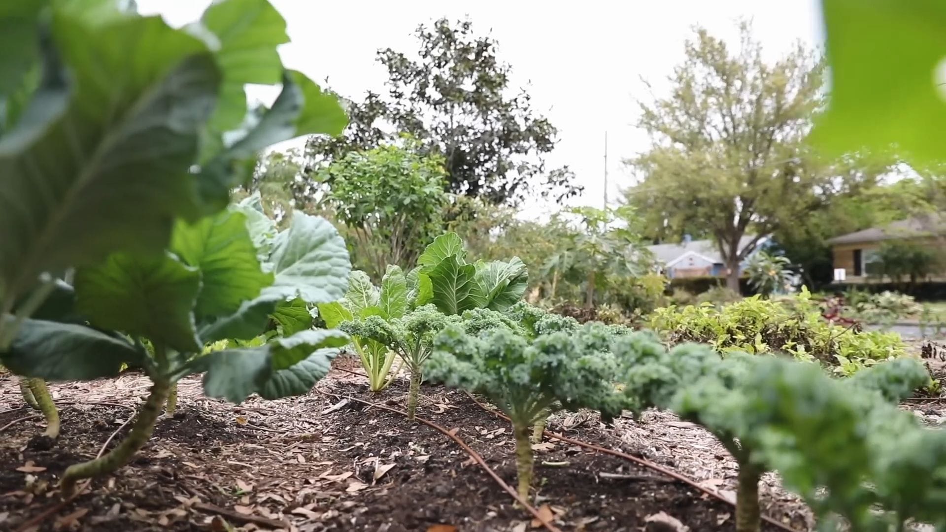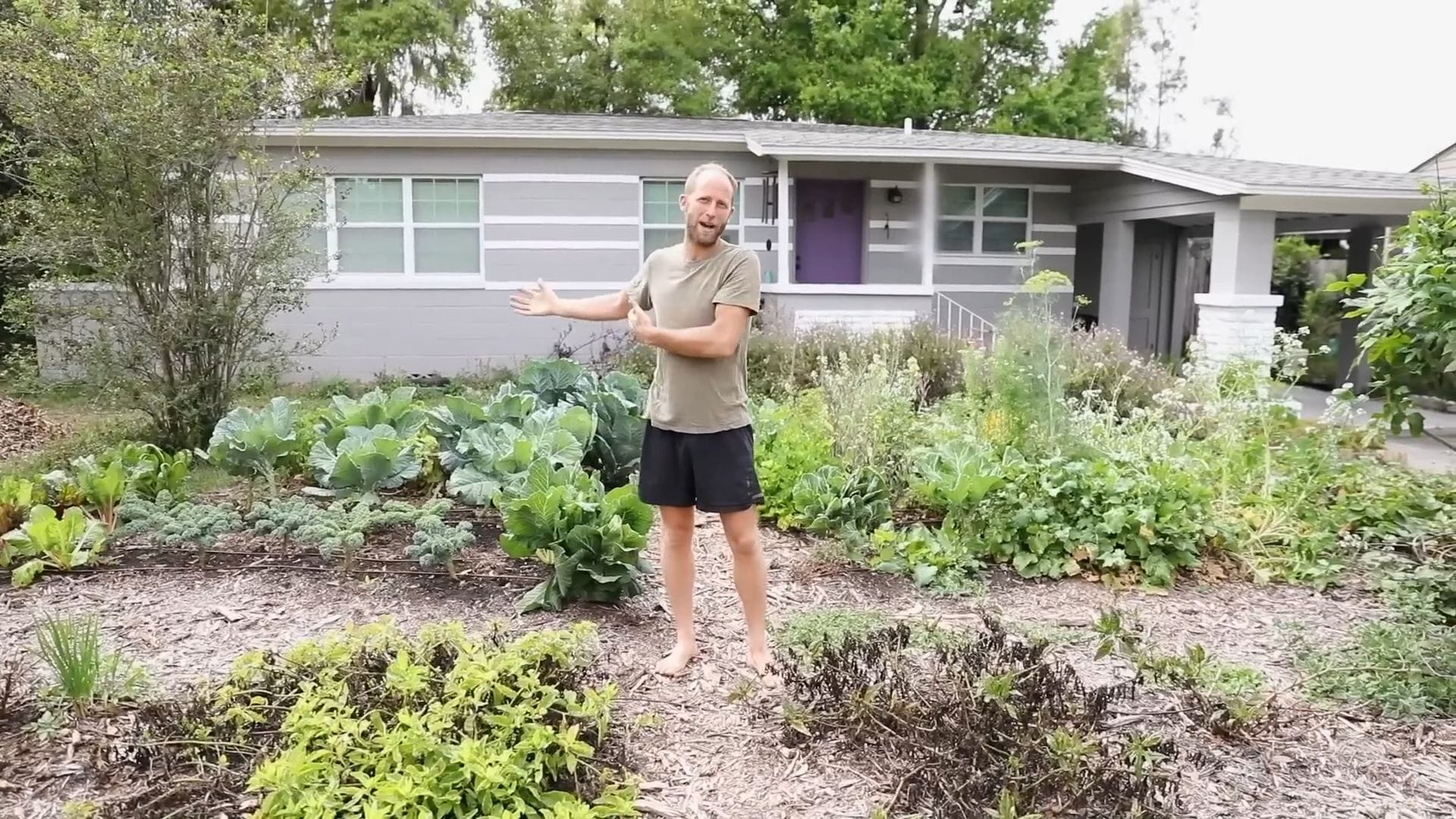 The front yard garden showcases an incredible variety of crops thriving in the urban environment.