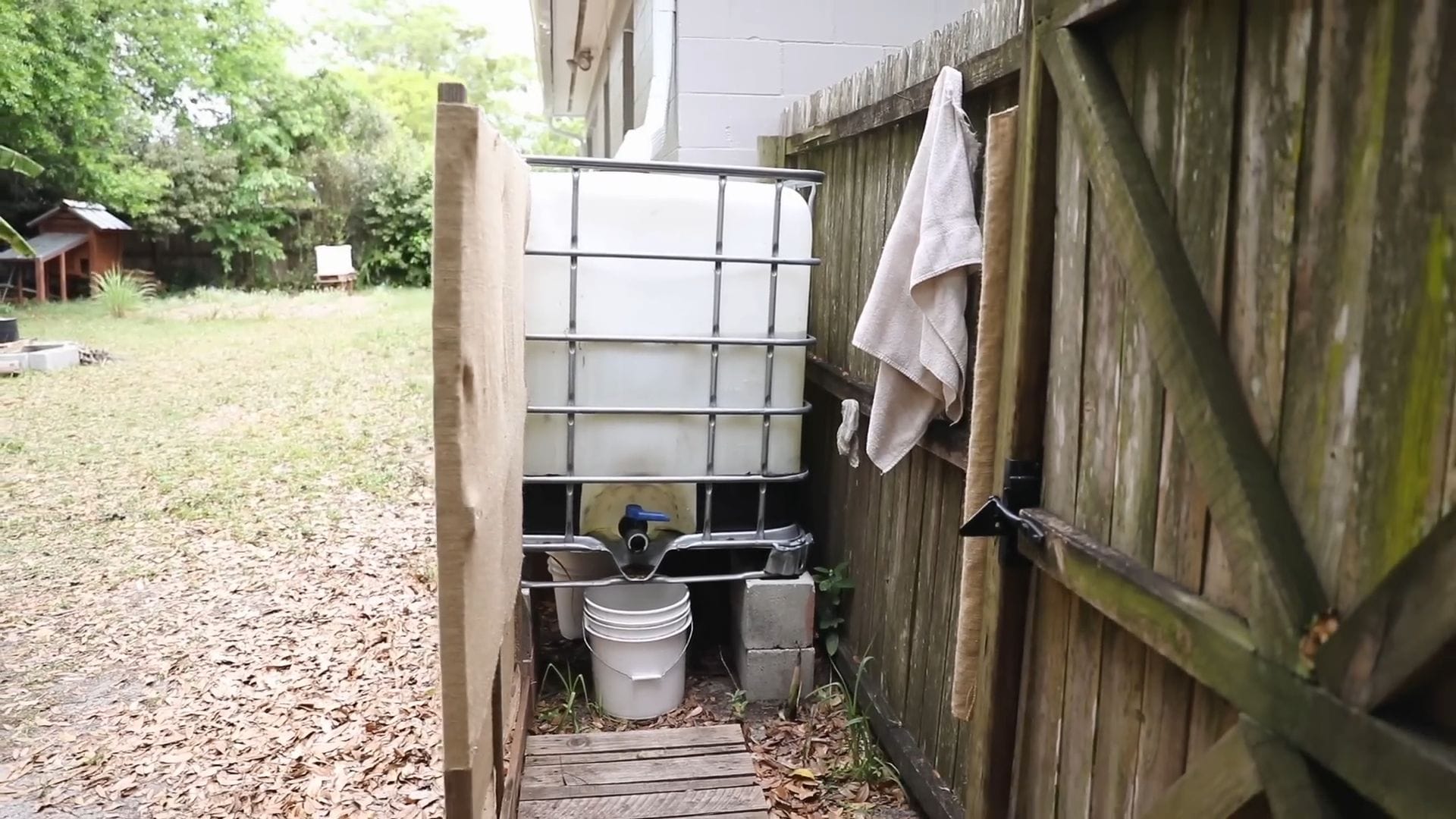 The rainwater shower represents Rob’s favorite way to clean up, utilizing another 275-gallon tote positioned for maximum collection from the main house.