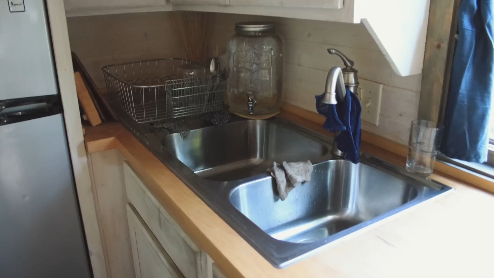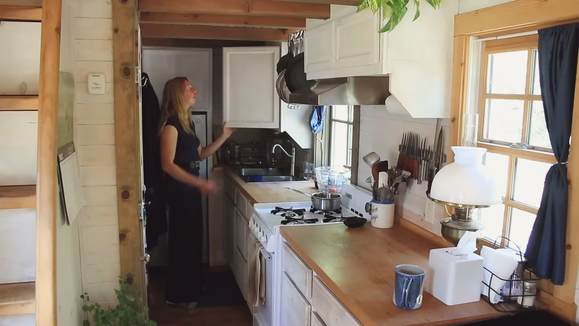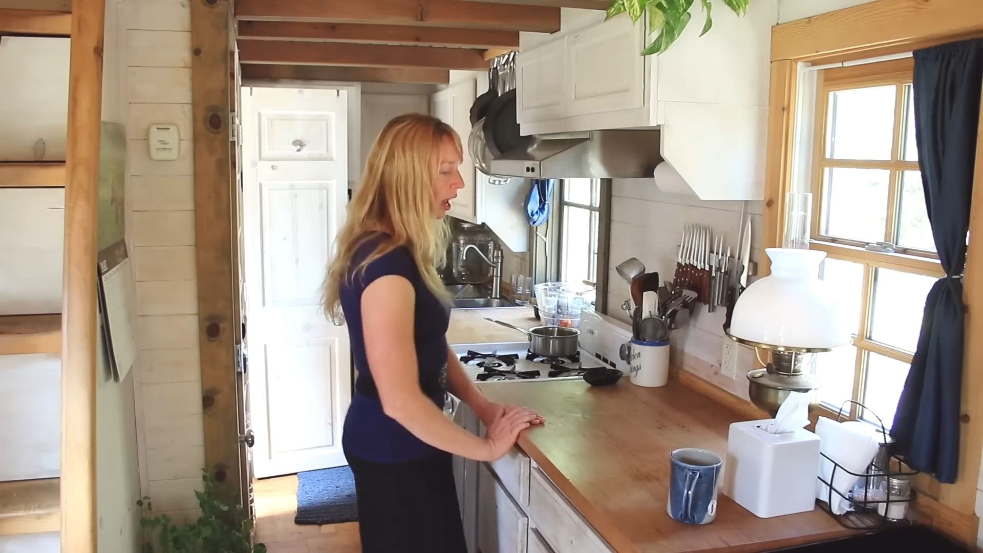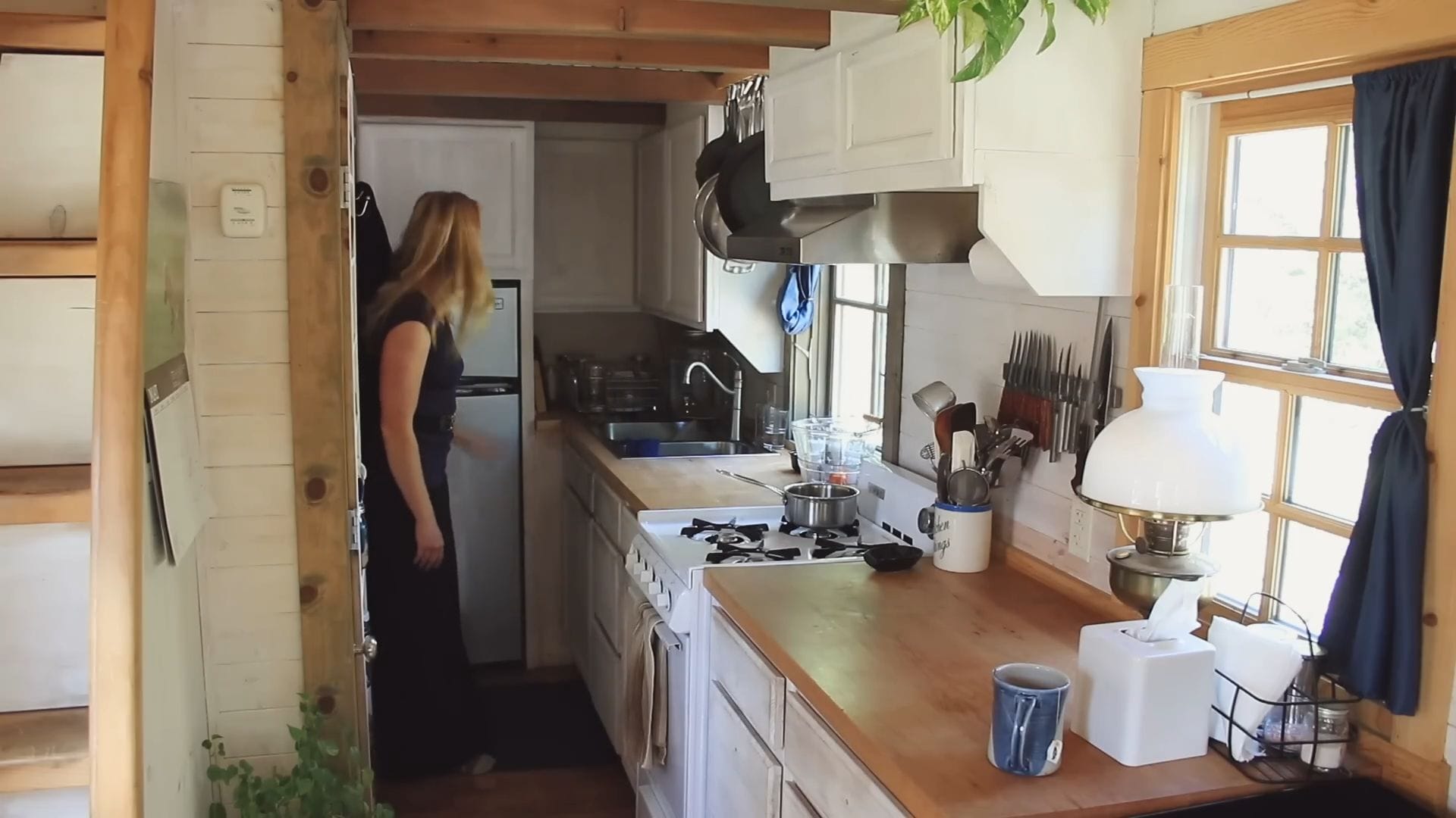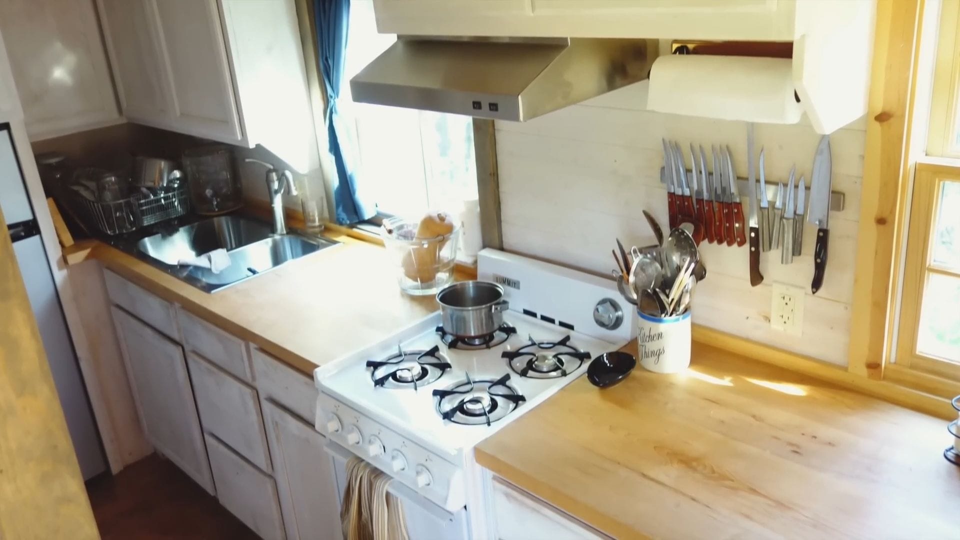 The kitchen occupies a full half of the home and showcases beautiful butcher block countertops flanking both sides of the stove and sink.