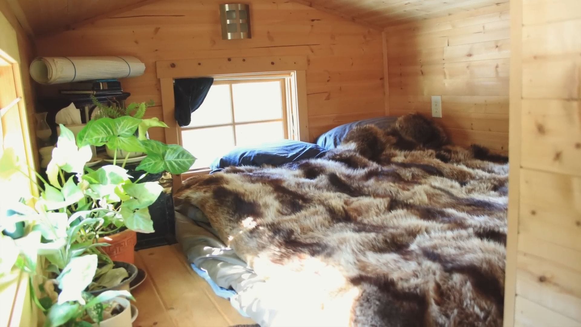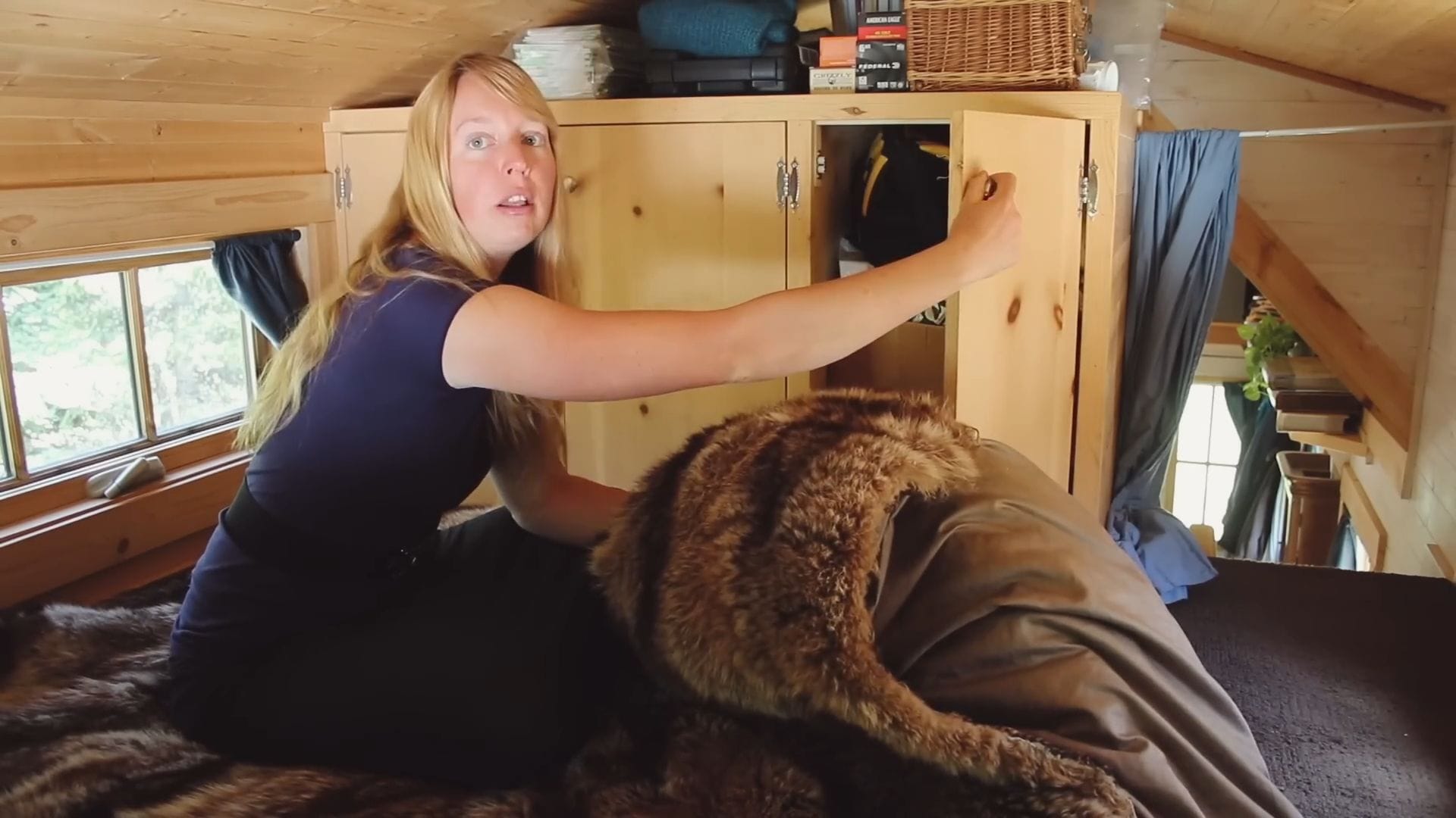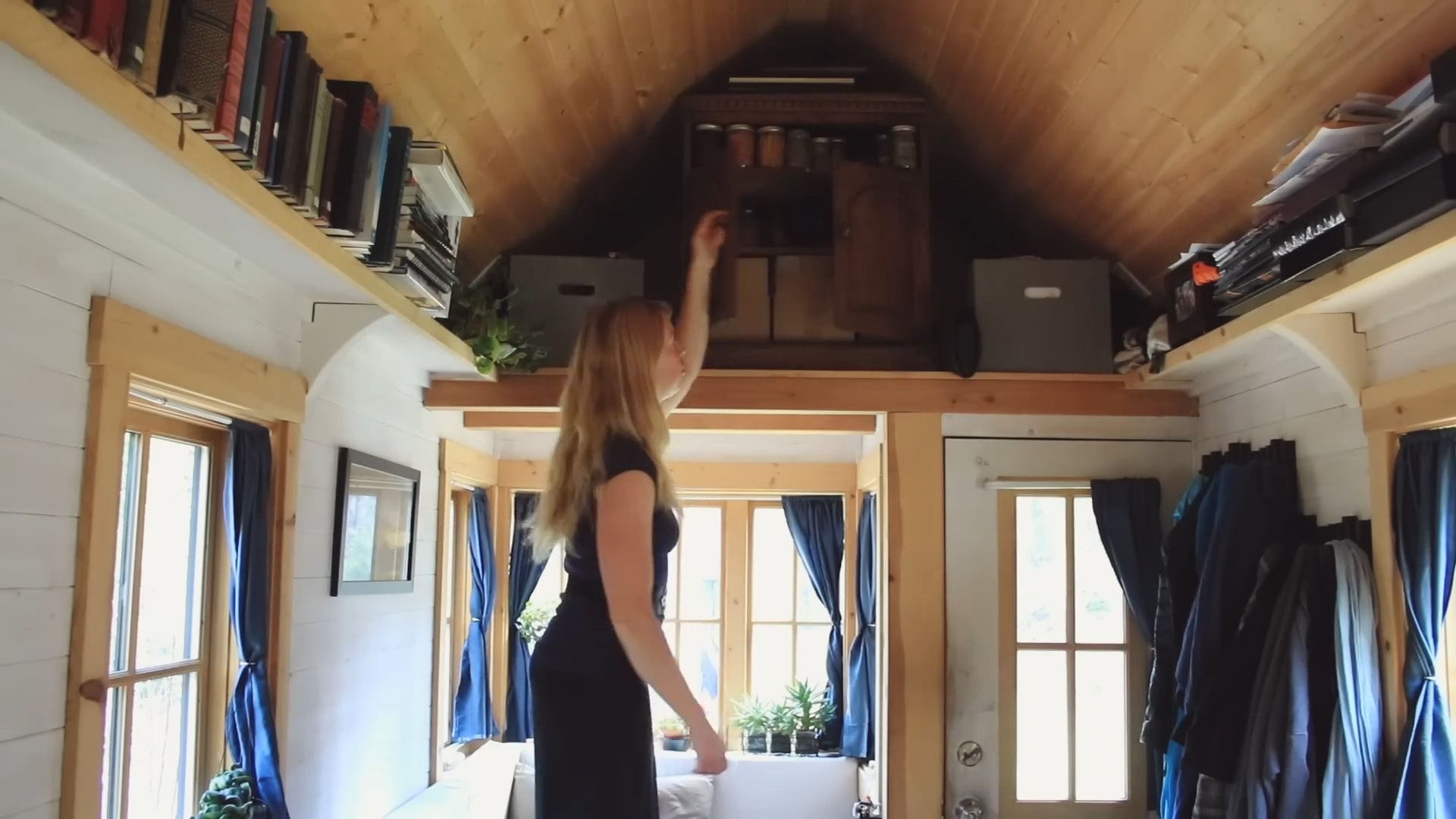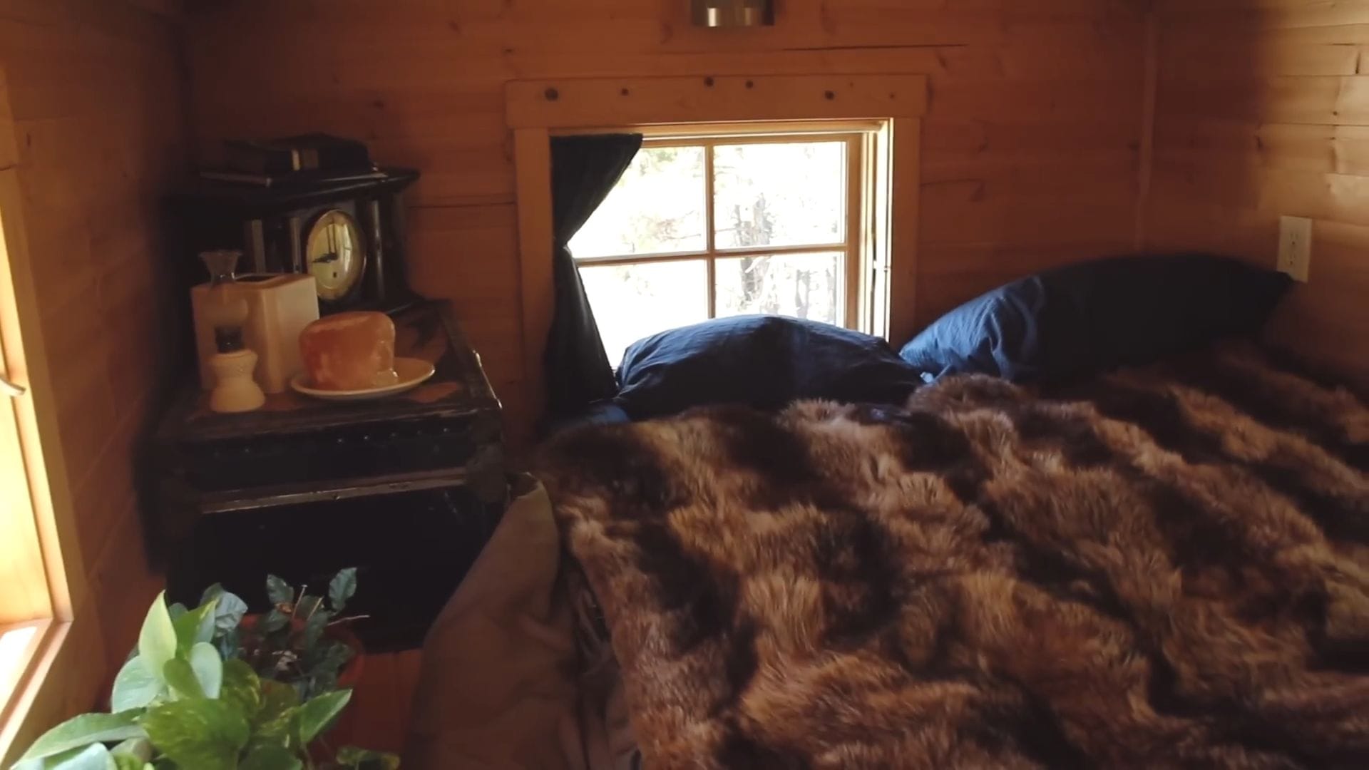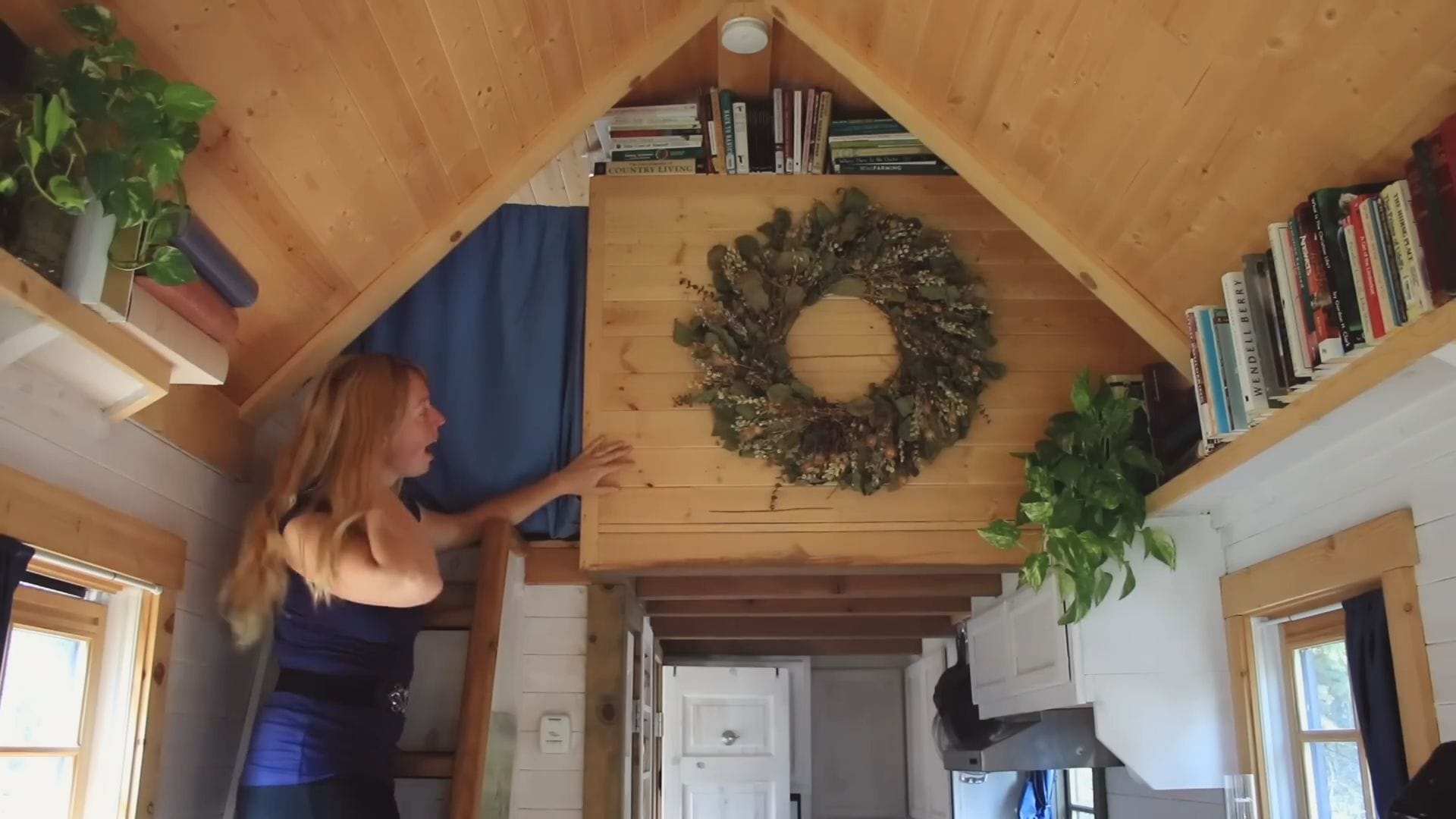 Climb up to discover the sleeping loft where a four-inch mattress sits directly on the floor, maximizing the available headroom throughout the space.