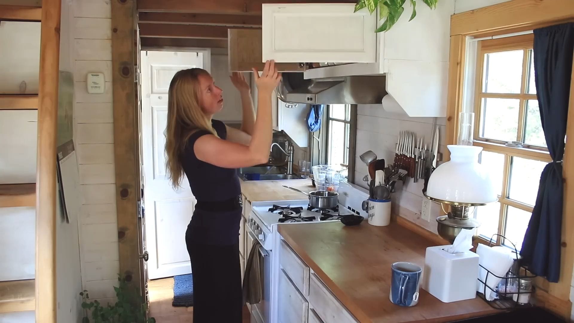 This upper cabinet provides additional food storage for canned goods and bulk items, accessible by simply stepping on the couch below.