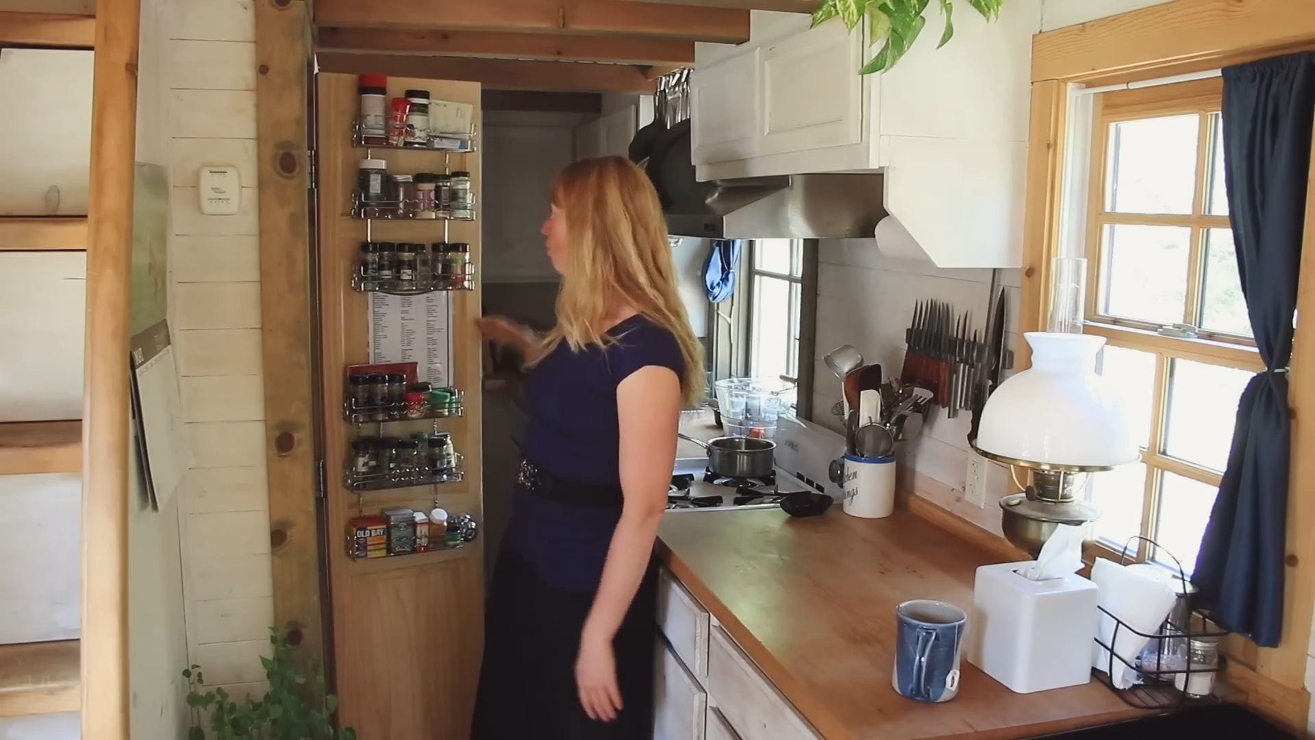 Additional storage holds an impressive collection of dishes and preserved foods, since the owner processes and stores much of her own harvest.