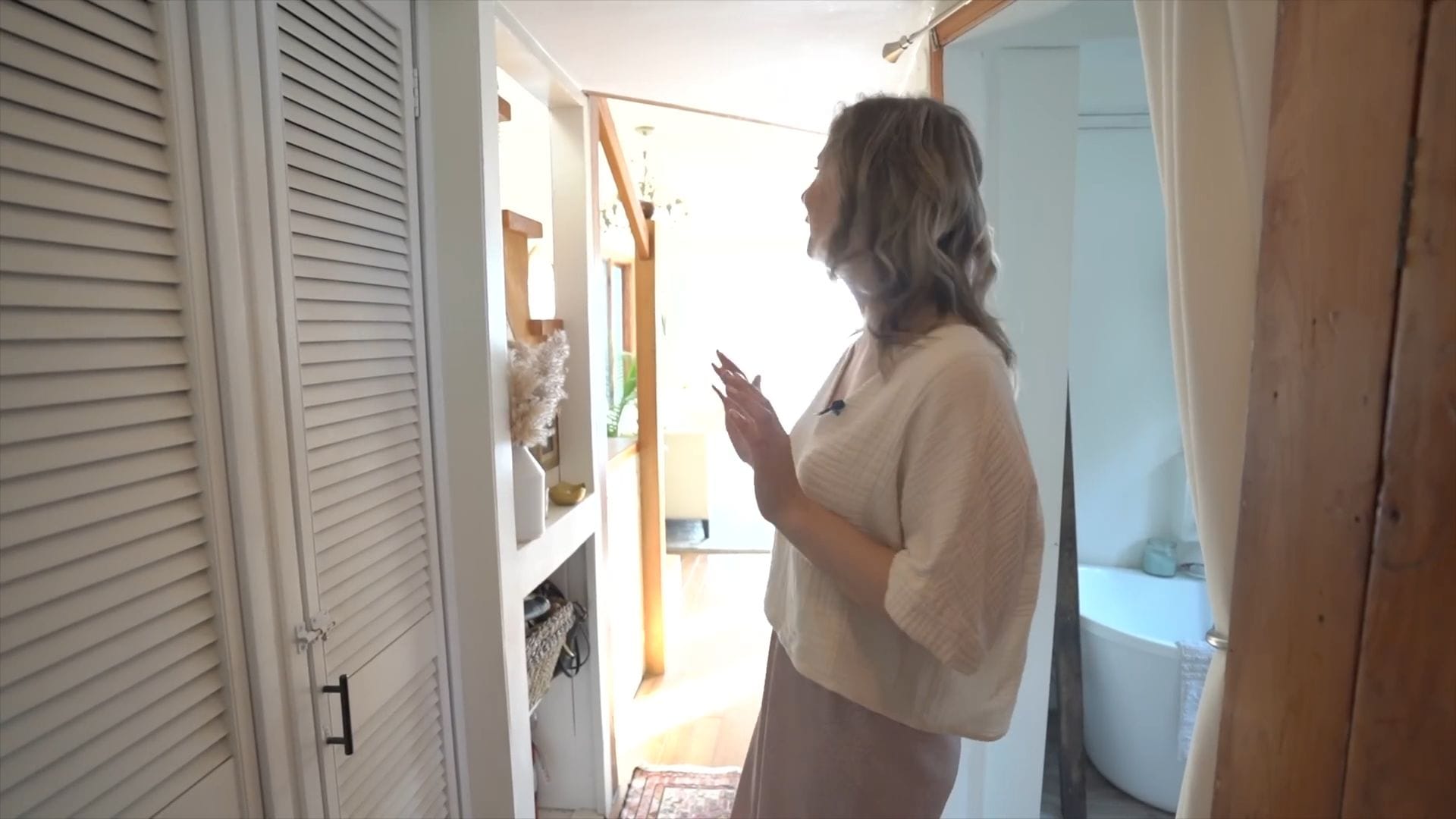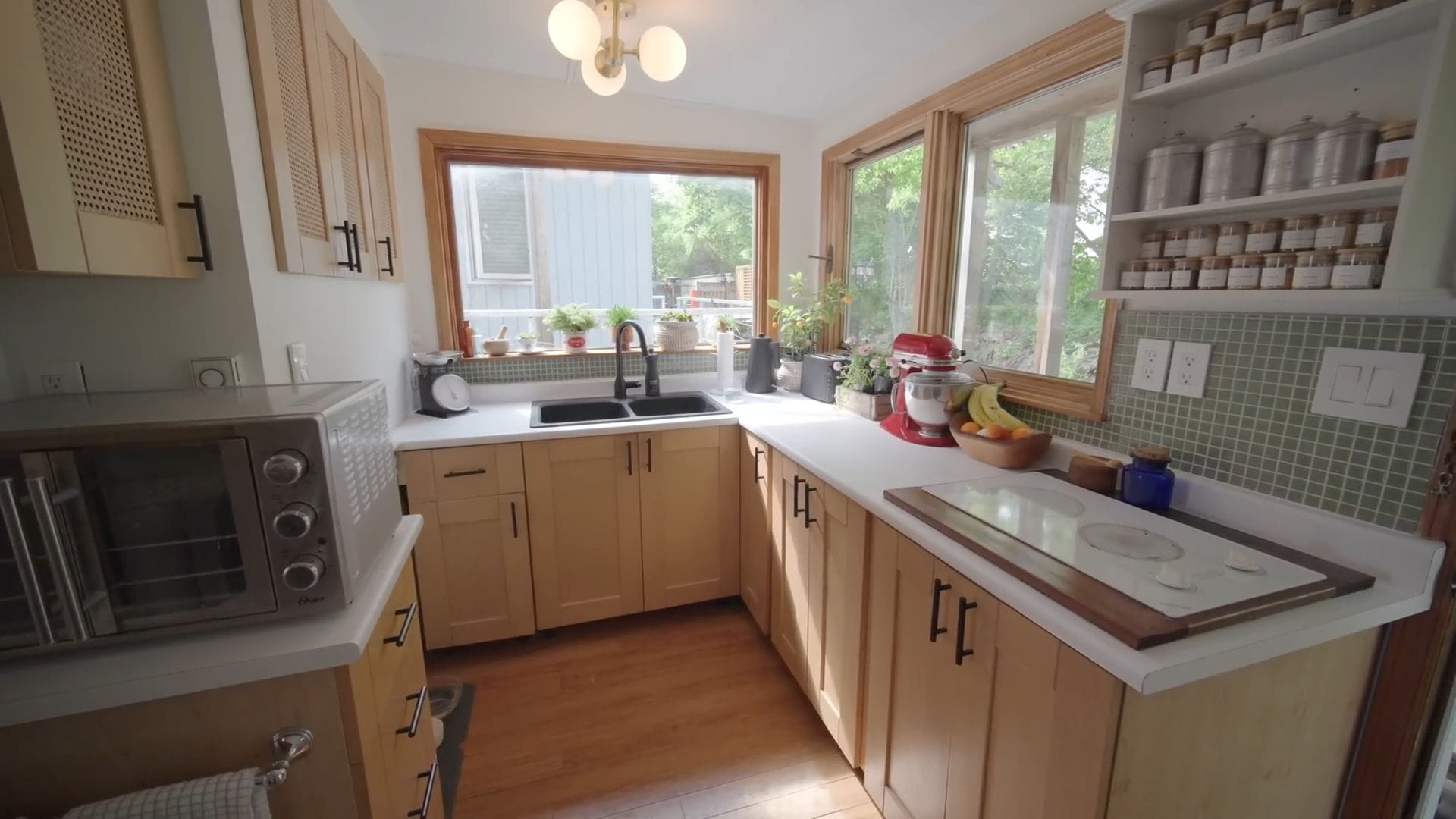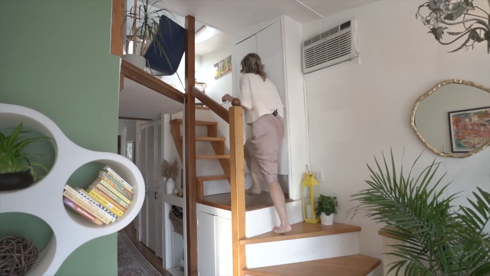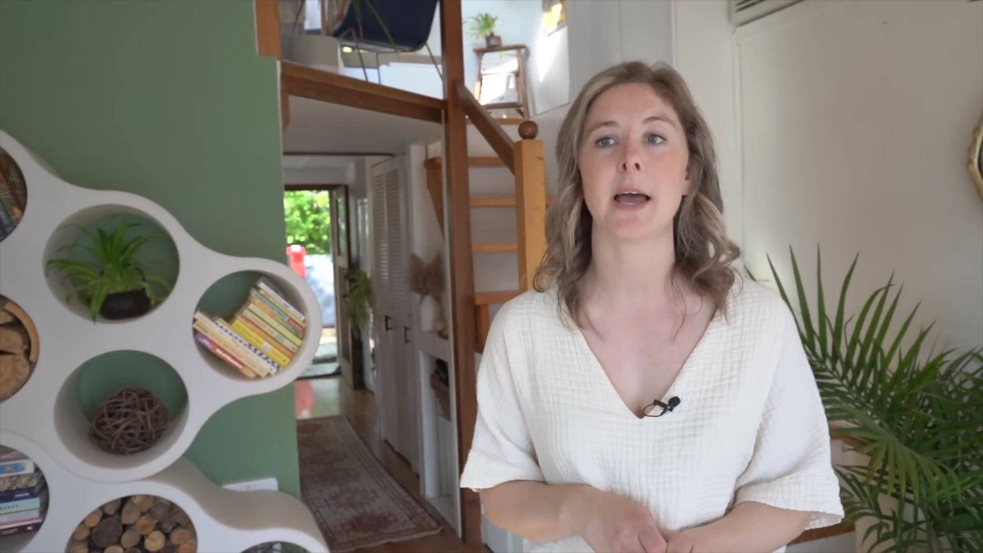 Thriving tomatoes and herbs grow in containers throughout this green oasis, creating a productive garden space that feels worlds away from urban life. The previous owners, elderly artists who lived here for 15 years, left some charmingly quirky design choices throughout the home. Originally, access to the bedroom required climbing an outdoor ladder and entering through a hatch – Kate can only imagine this sweet old lady in her nightgown braving winter weather to reach her bedroom via ladder and window.