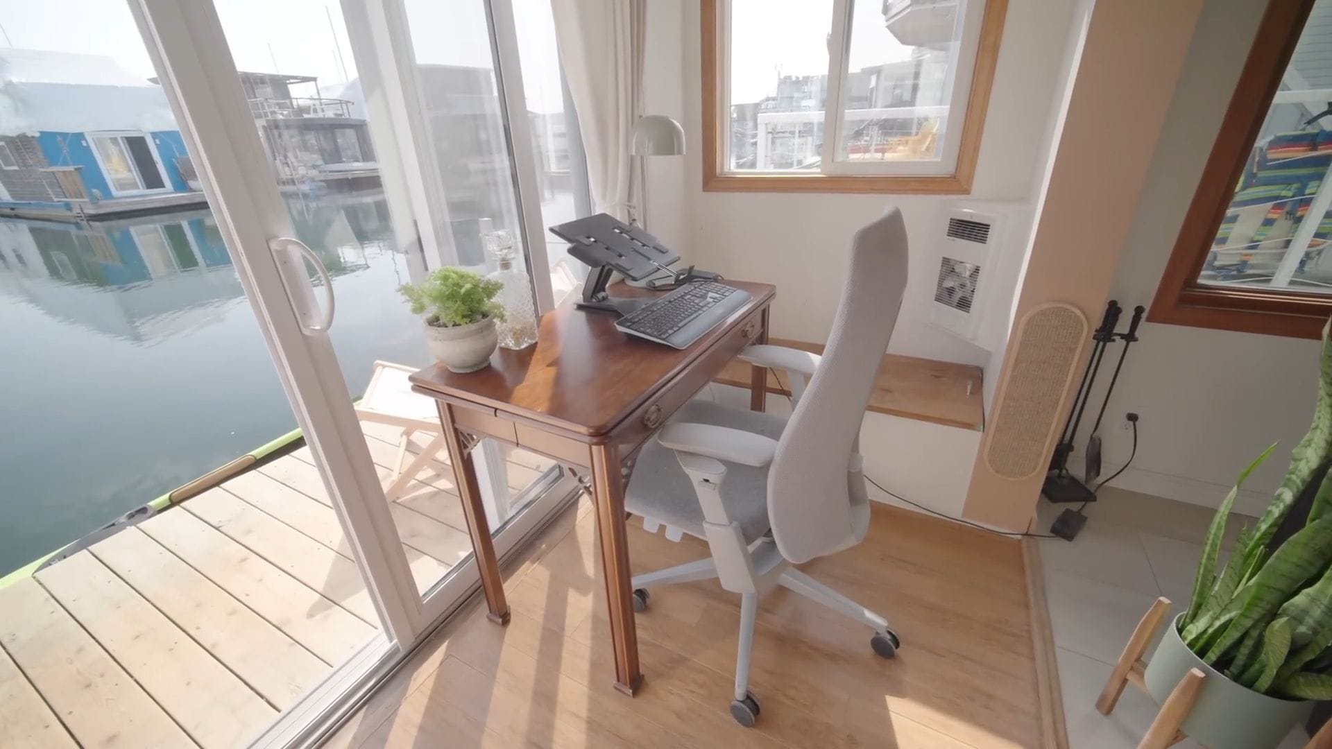 The separate toilet room includes the only closing door in the entire home and offers additional storage that was added during the initial move-in period. The living room stands as Kate’s favorite space and truly the crown jewel of this floating home – a multi-functional area serving as living room, office, and dining room all in one. This bright, beautiful space was the primary attraction that drew her to this particular houseboat, and it’s easy to see why.