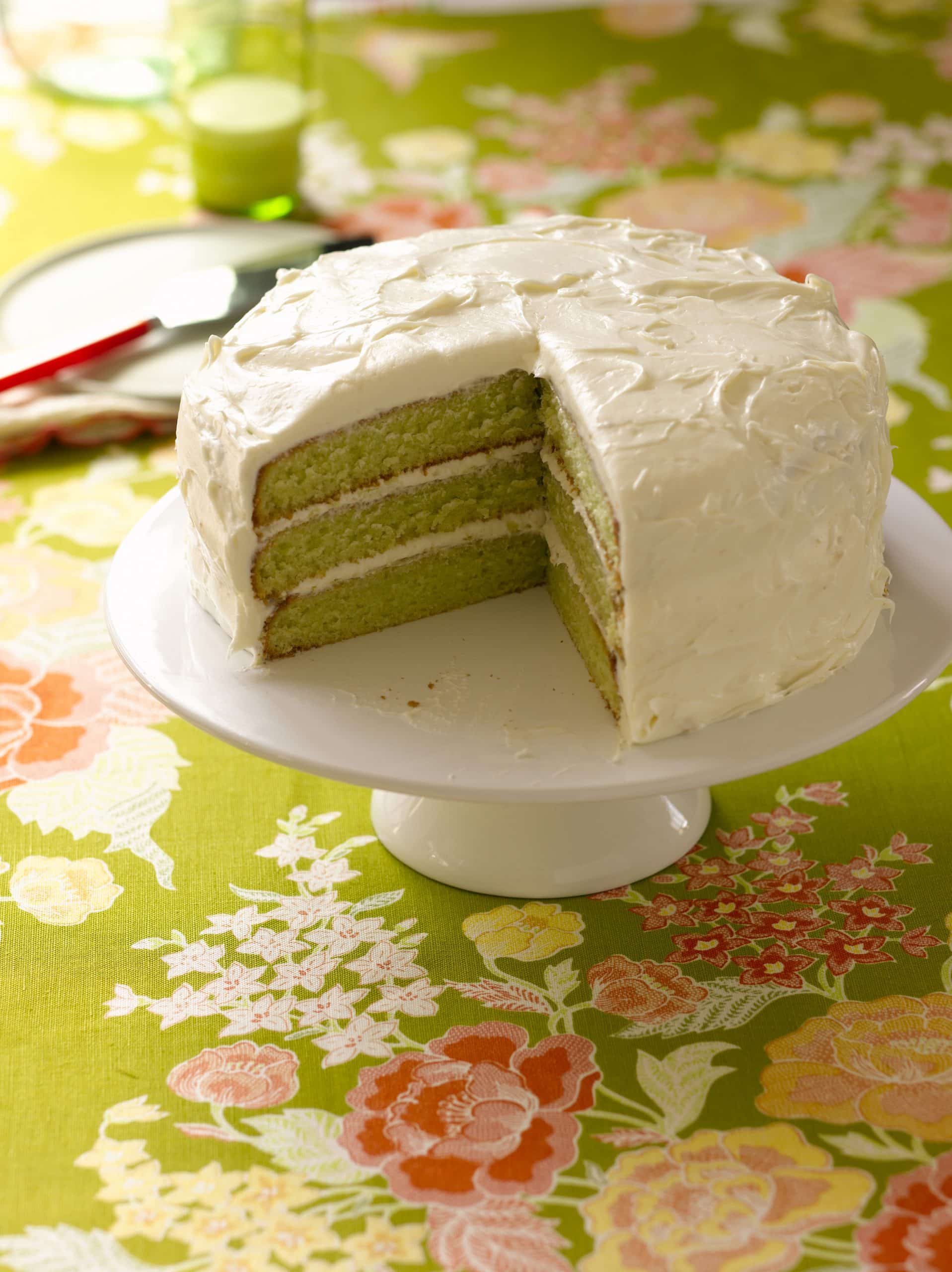 It uses key lime gelatin and a cream cheese icing. This cake is a big hit because of its mix of tangy lime and sweet icing. It has become popular through the Food Network and Trisha’s cookbooks.