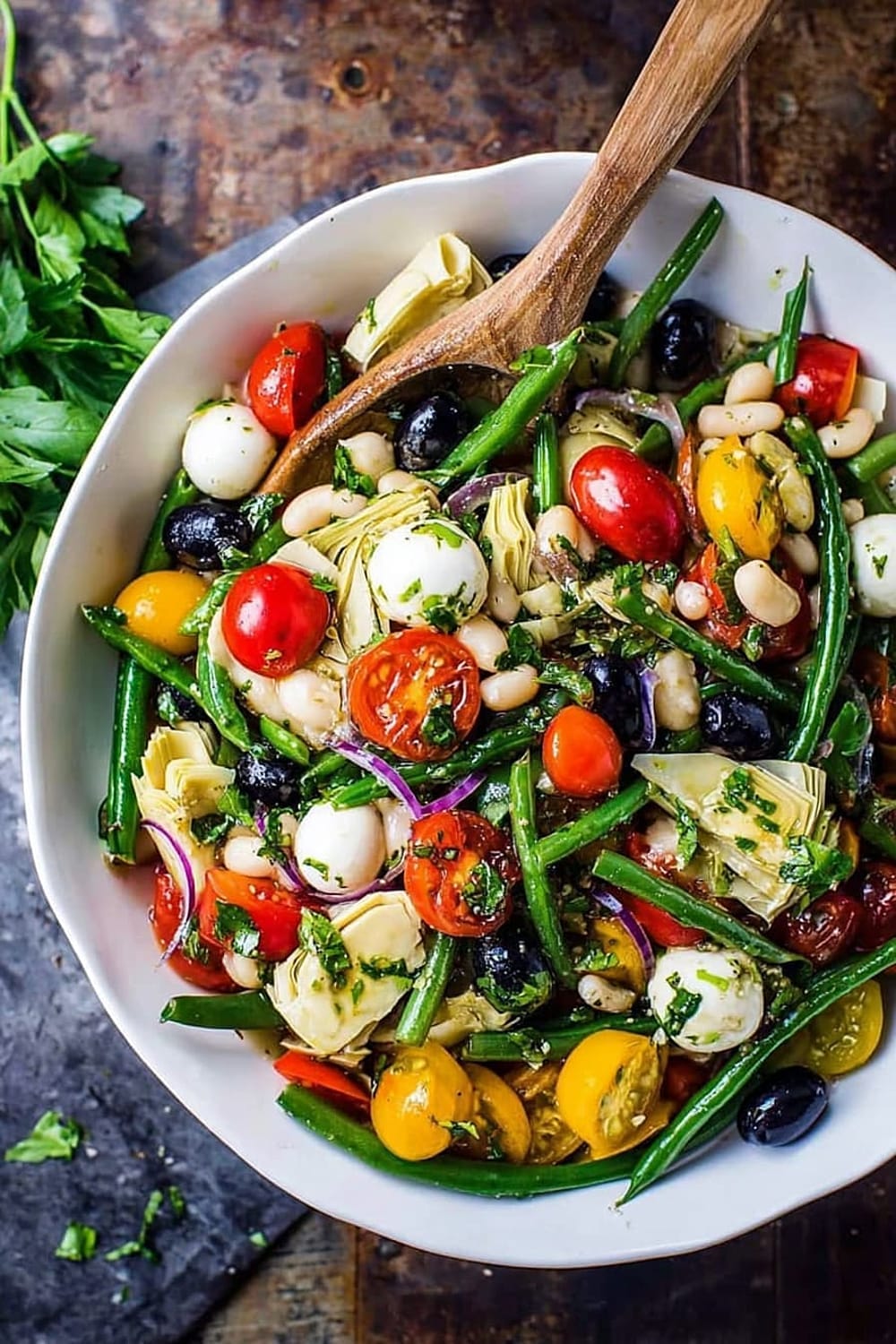 - 3 In a large mixing bowl, combine the blanched and cooled green beans with the drained white beans (or tuna if using), drained artichoke hearts, and drained olives. Using a large spoon or tongs, gently mix these base ingredients to distribute them evenly throughout the bowl.