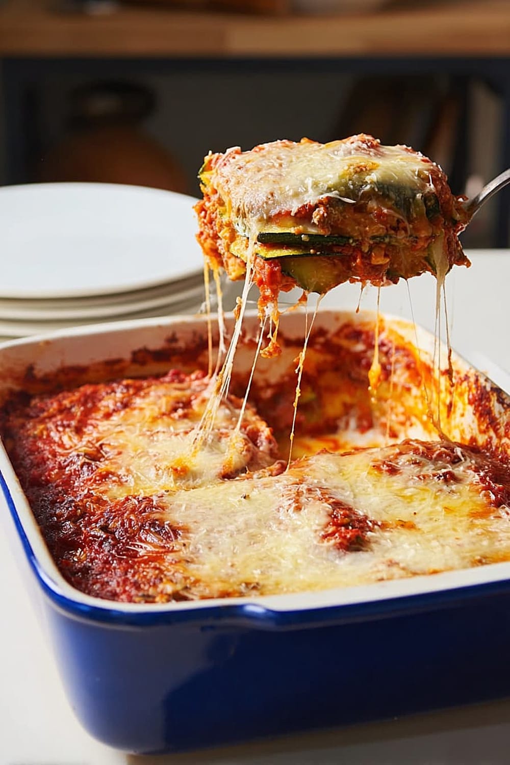 - Protein boost: Layer 1 pound cooked ground turkey between zucchini layers